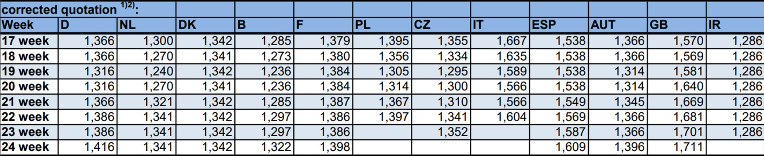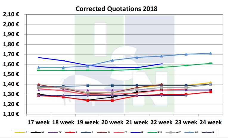 法國生豬價格上漲幅度1.2歐分,法國供屠宰的生豬數(shù)量在下降。奧地利和德國上漲3歐分。奧地利生豬數(shù)量下降15%,主要原因是天氣太熱。西班牙生豬體重在下降。荷蘭和丹麥生豬價格沒有變化。丹麥生豬價格已經(jīng)連續(xù)11周保持不變。德國四家大型屠企(Toennies、Vion、Westfleisch、Danish