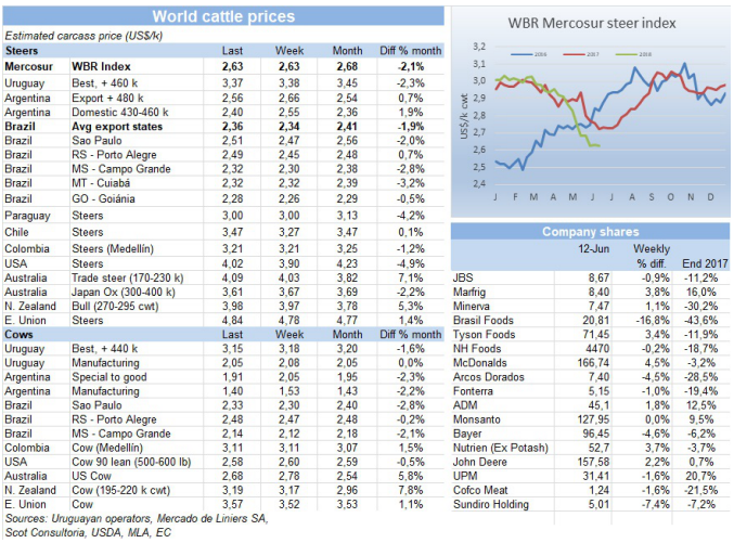 本周南方共同市場閹牛指數(shù)保持在2.63美金/公斤,本周阿根廷比索再度貶值4.1%,雖然本地閹牛價(jià)格上漲,但換算成美金還低了10美分,2.56美金/公斤,而巴西亞雷爾增值1.5%,雖然閹牛價(jià)格低了1亞雷爾/公斤,換算成美金還高了2美分,2.36美金/公斤。烏拉圭和巴拉圭牛價(jià)幾乎不變。