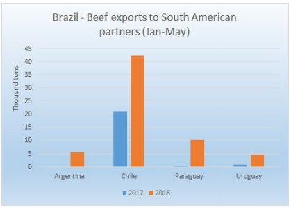 由于亞雷爾兌美元貶值嚴(yán)重,巴西牛價(jià)大幅下滑,使得2018年對(duì)南美其他國家出口量增長兩倍,一到五月總共對(duì)智利,阿根廷,巴拉圭和烏拉圭出口62400噸牛肉,其中冷凍牛肉增幅比冷鮮要高,但是平均牛價(jià)與去年同期相比從4343美金降低到3711美金。南美主要牛肉進(jìn)口國智利從巴西進(jìn)口了42300噸牛肉,比去年同期增長一倍,主要是巴西牛價(jià)低以及巴拉圭某些工廠關(guān)閉導(dǎo)致。預(yù)期今年巴西對(duì)南美地區(qū)出口會(huì)一直保持在高水平。