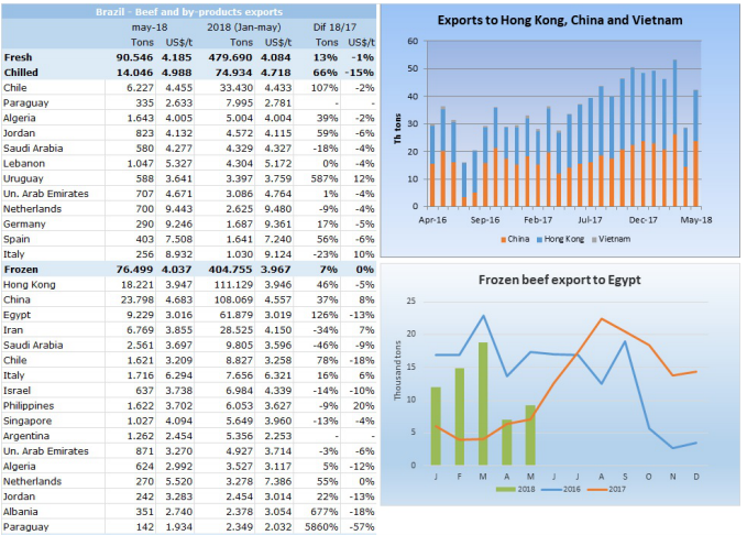 巴西對(duì)中國牛肉直接出口量超過了去香港的量,達(dá)到了23798噸,香港為18221噸,主要是近期從香港到中國運(yùn)輸很困難,不過一到五月出口香港的牛肉還是最多,達(dá)到了111129噸,然后是出口中國108069噸。中國香港和越南五月一共買了42162噸,比四月份28619噸增加了47%,比去年五月增加25%。第三大出口國是埃及,五月共買了9229噸,雖然比四月多了7000噸,還是遠(yuǎn)低于第一季度平均水平。