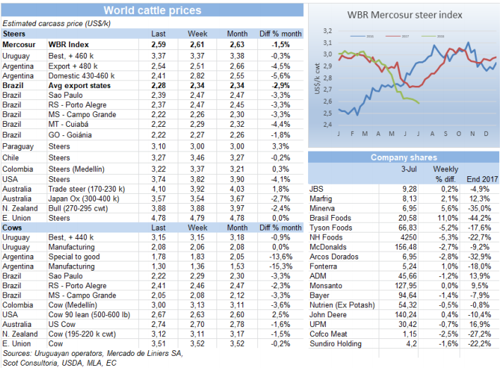 本周南方共同市場(chǎng)閹牛價(jià)格2.59美金/公斤,今年最低,比年初跌了42美分,即14%。價(jià)格下跌主要原因是巴西和阿根廷貨幣的貶值,今年雷亞爾貶值20%,比索貶值51%,此外巴西本地牛價(jià)也下跌了5%。按美金價(jià)來(lái)說(shuō),阿根廷下跌24%,巴西21%,巴拉圭9%,只有烏拉圭漲價(jià)13%。