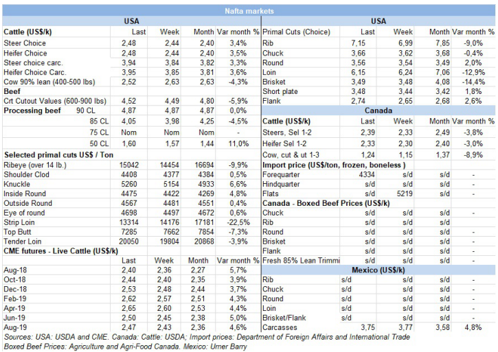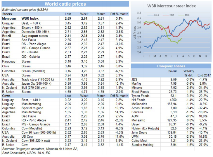本周各國貨幣尤其是巴西雷亞爾增值,使閹牛價(jià)格上漲,南方共同市場閹牛指數(shù)上漲5美分到2.69美金。巴西雷亞爾對美金增值2.5%,部分原因是總統(tǒng)候選人Geraldo Alckmin受歡迎度很高,10月大選前景比較被看好,而且本地牛價(jià)也增加了0.3雷亞爾/公斤,綜合起來育肥牛價(jià)格漲了7美分到2.41美金,9周以來最高。烏拉圭閹牛價(jià)格由于供應(yīng)緊缺也漲了,阿根廷牛價(jià)穩(wěn)定,貨幣也穩(wěn)定,連續(xù)四周價(jià)格不變,巴拉圭由于處于口蹄疫接種時(shí)期,市場比較平靜,牛價(jià)保持不變。