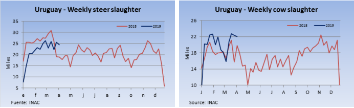 上漲的主要是面向國內(nèi)市場的待宰牛,小牛犢和小閹牛價格自年初以來漲了40%,最近由于價格回調(diào),總漲幅應(yīng)該在35%左右,年初預計出口活牛價格會上漲15%,但目前也已經(jīng)遠遠超過這個漲幅。雖然屠宰量還是很高,但從結(jié)構(gòu)來看屠宰增加的主要是母牛,二月屠宰量同比增加29%,而小牛犢和閹牛屠宰量減少了15%。面向本地市場的小牛犢和閹牛供應(yīng)短缺,主要因為飼育場利潤率不足而進行存欄清盤,同時夏季良好的飼草情況也使活牛生產(chǎn)商可以等待合理的時機出售。