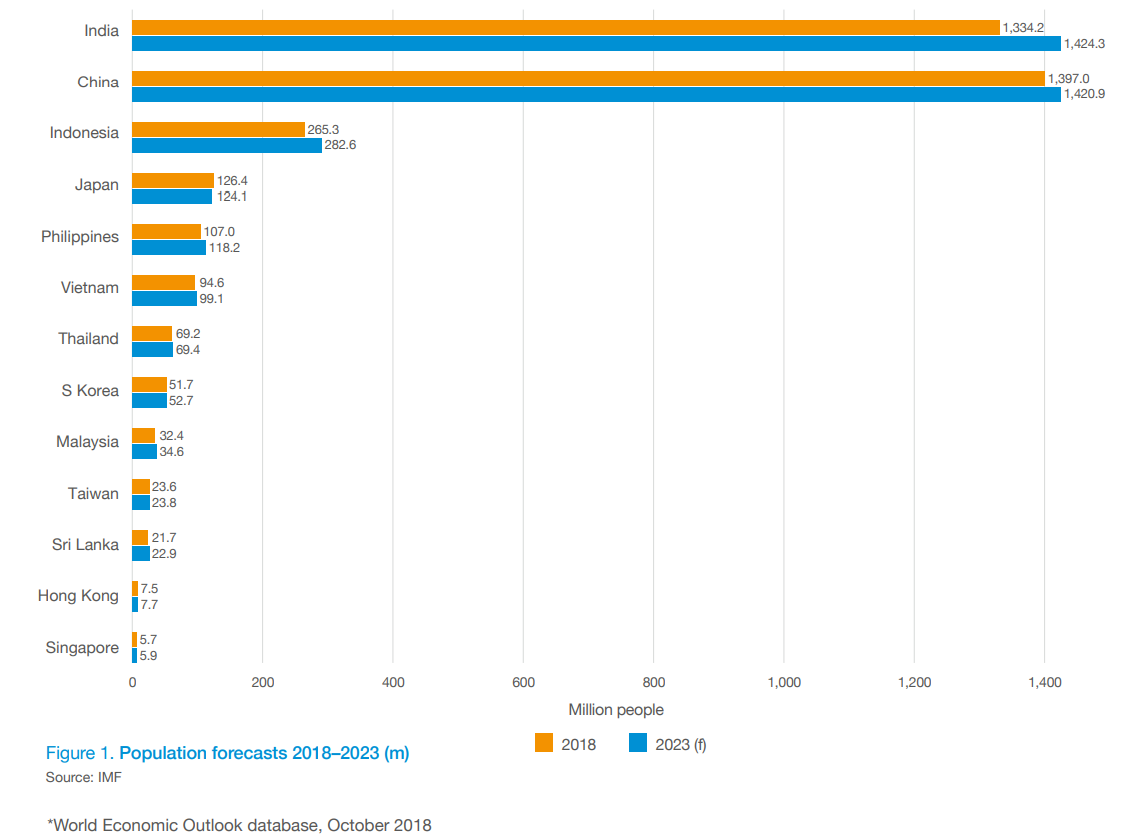 2009年全球中產(chǎn)階層18億人口,2020年預(yù)計(jì)達(dá)到32億人口,2030年預(yù)計(jì)達(dá)到49億人口,中產(chǎn)階層增長(zhǎng)主要來(lái)自亞洲,約占全球中產(chǎn)的66%,占2030年中產(chǎn)階層消費(fèi)總量的59%。人口只是分析市場(chǎng)潛力的一個(gè)因素,其他因素比如:收入增長(zhǎng)和文化影響,可能更重要。盡管印度有望成為人口第一大國(guó),但印度的肉類年人均消費(fèi)僅3.3公斤,其他亞洲市場(chǎng)對(duì)于出口商來(lái)說(shuō)更具吸引力。(圖一:2018-2023年人口預(yù)測(cè)(單位:百萬(wàn)))