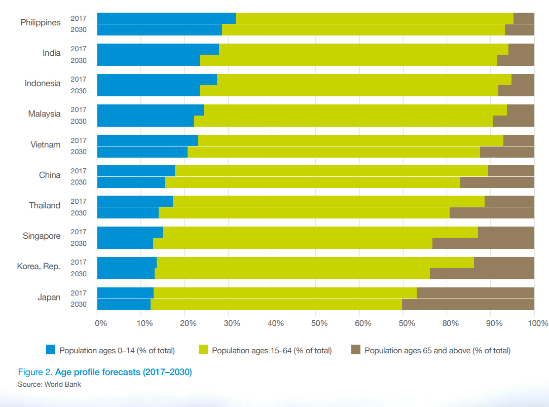 另一個(gè)影響亞洲的是明顯的人口結(jié)構(gòu)變化。到2050年亞太地區(qū)超過(guò)25%的人口是60歲以上,較2016年數(shù)量翻番。韓國(guó)和日本已經(jīng)是老齡化國(guó)家,中國(guó)開(kāi)始出現(xiàn)老齡化問(wèn)題。(圖二:2017-2030年年齡結(jié)構(gòu)預(yù)測(cè))