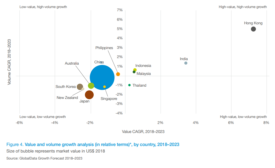 亞太地區(qū)是世界第一大肉類消費(fèi)市場(chǎng),2018年該地區(qū)肉類消費(fèi)占全球消費(fèi)總額的30%。2018-2023年年復(fù)合增長(zhǎng)率預(yù)計(jì)為2.2%。(圖四:2018-2023年肉類消費(fèi)總額和數(shù)量增長(zhǎng)分析)