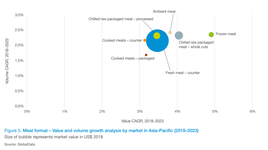 2017年AHDB調(diào)研結(jié)果顯示52%的日本受訪者選擇保質(zhì)期作為判斷肉品質(zhì)量的第一選擇。圖五圖表顯示冷凍肉無(wú)論是數(shù)量還是數(shù)額未來(lái)都將是增長(zhǎng)幅度最大的。(圖五:2018-2023年肉類結(jié)構(gòu):亞太地區(qū)市場(chǎng)數(shù)額和數(shù)量增長(zhǎng)分析)