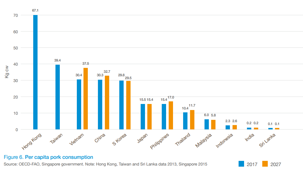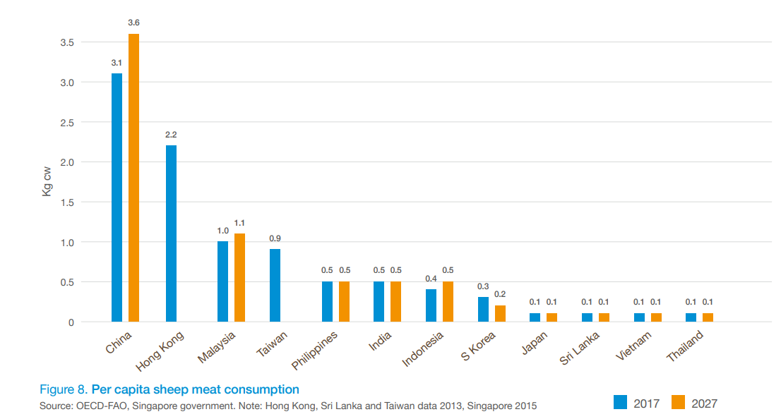 到2027年預(yù)計(jì)越南豬肉和牛肉消費(fèi)增長(zhǎng)幅度最大,中國(guó)羊肉消費(fèi)增長(zhǎng)幅度最大。(圖六-八:豬肉/牛肉/羊肉人均消費(fèi)量)