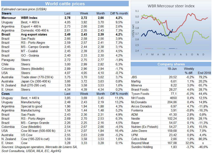 活牛價格堅挺、貨幣穩(wěn)定推高了南方共同市場閹牛價格,本周增長了6美分到2.78美金/公斤,達到2018年五月以來最高值。巴西重新可以出口中國之后,活牛價格上漲,把之前的跌幅全部漲回來了,主要出口州育肥閹牛價格漲了3雷亞爾/15公斤,達到140.5雷亞爾,換算成美金漲了6美分到2.49美金。烏拉圭牛價漲到4美金以上,自2011年以來第一次,阿根廷閹牛價格和上周一樣,但比索增值2.6%,美金牛價漲了7美分到2.73美金,只有巴拉圭牛價小幅下跌3美分到2.72美金。