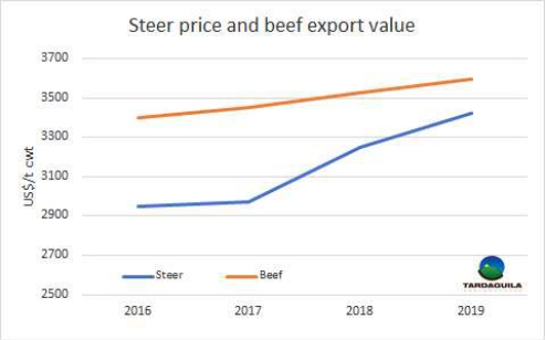 2017年國家肉類協(xié)會審查的16家工廠里有11家虧損,而現(xiàn)在的情況只會更糟,因為占成本70-80%的活牛采購價格上漲的比牛肉銷售價格高出太多,2017年閹牛采購均價大約2970美金/噸,而平均出口價格為3452美金,差價約16%。2018年烏拉圭活牛市場由于更加缺牛,閹牛采購價格漲到3250美金/噸,而出口均價漲幅不大,因此差價縮小到9%。2019年至今牛價大幅上漲,閹牛采購均價漲到3420美金/噸,只比出口均價3593美金低不到5%。