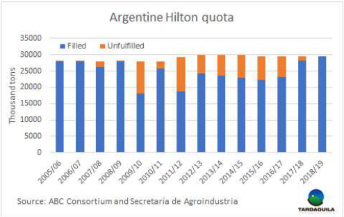 截止到上周,也就是離2018/19財政年不到20天的時間,阿根廷已經(jīng)發(fā)運了29440噸希爾頓配額牛肉,幾乎馬上能完成29500噸的配額,這是自2008/09年以來阿根廷第一次能完成希爾頓配額,去年完成了配額的95%(28091噸)。2018/19年58%的牛肉去了德國,20%去荷蘭,5%去意大利。同時截止到五月阿根廷發(fā)運了7573噸481配額牛肉。