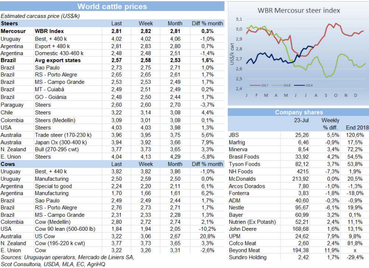 本周南方共同市場閹牛價格又跌了1美分到2.81美金/公斤,原因主要是巴西本地牛價的下跌,本周跌了0.6雷亞爾/15公斤,阿根廷比索也繼續(xù)貶值,使阿根廷美金牛價跌了2美分到2.81美金。
