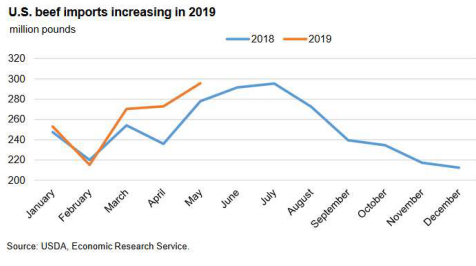 根據(jù)USDA最新預(yù)測,明年美國牛肉和豬肉進(jìn)口量會減少,羊肉進(jìn)口量保持不變,大洋洲由于天氣原因存欄減少,牛肉供應(yīng)量持續(xù)減少,預(yù)計美國牛肉進(jìn)口量會減少3%,由于中國市場非洲豬瘟導(dǎo)致的高需求,以及全球豬肉供應(yīng)減少,美國豬肉進(jìn)口量預(yù)計會減少4%,美國國內(nèi)牛肉和豬肉產(chǎn)量分別會提高1.1%和2.8%,也減少了對進(jìn)口肉的需求。2019年美國牛肉進(jìn)口量增加,五月進(jìn)口量達(dá)到2.96億磅,同比增加6%,除了新西蘭外其他國家對美國出口量都增加,其中澳洲前五個月出口量同比增加14%,主要因為今年上半年澳洲屠宰量增加。