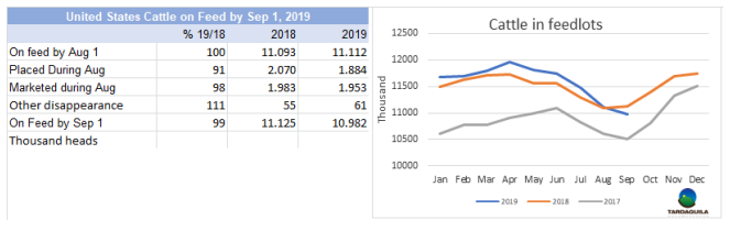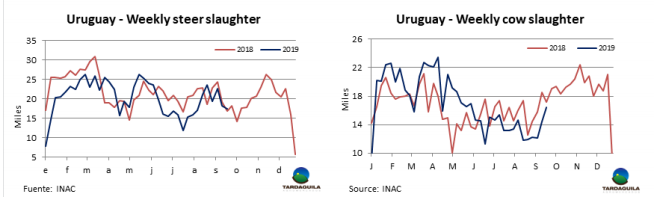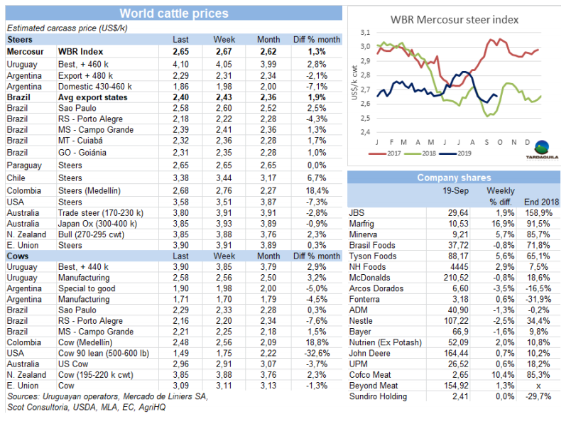 (3998頭),Las Piedras (3644頭),NH-BPU(3637)。Marfrig三家工廠共屠宰9519頭,Minerva兩廠共屠宰7513頭。9月截止目前,共屠宰122334頭牛,比去年同期減少7.3%,預計本月屠宰量將近17萬頭,比2018年9月減少1萬頭,年屠宰量的差距將縮小,過去三個月屠宰量減少1.9萬-2.9萬頭。