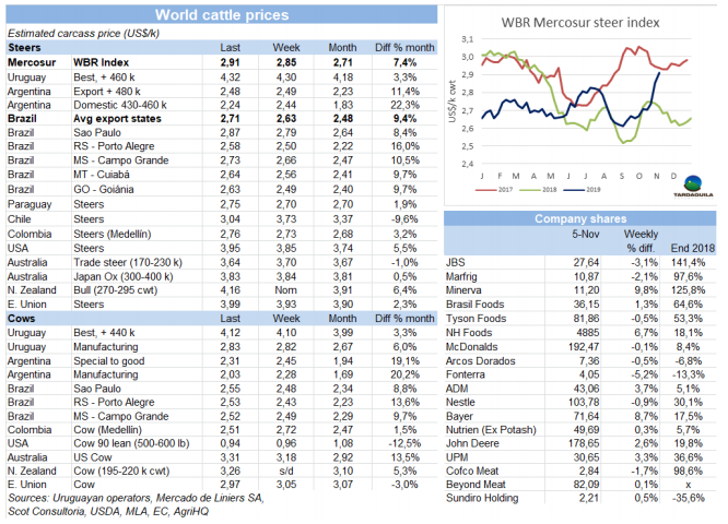 大選結(jié)果確定和貨幣兌換管控過后閹牛價格穩(wěn)定。英國純種閹牛報價140-145比索/公斤,印度串種閹牛報價136-140比索/公斤,母牛價格上漲趨勢受中國需求影響,價格上漲至優(yōu)種閹牛水平:特種和良種母牛報價140-145比索/公斤,工業(yè)母牛報價125-130比索/公斤。北美