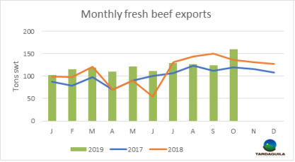 中國市場的更好機會使冷凍牛肉到歐洲市場出口量減少至本世紀初口蹄疫危機后最低水平。根據(jù)海關(guān)出口數(shù)據(jù),10月冷凍牛肉到歐洲出口量僅323噸,今年截至10月,出口量總計7796噸,比2018年同期減少44%。另一方面,冷鮮牛肉出口至歐洲共1044噸,因為上個月481配額范圍內(nèi)的發(fā)貨量幾乎為零。今年截至目前冷凍牛肉和冷鮮牛肉出口至歐洲量減少21%,減少至2.8萬噸。