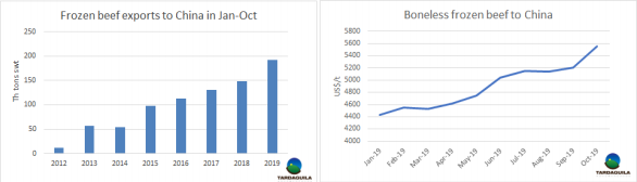 10月烏拉圭共出口冷凍牛肉24165噸,其中出口中國19941噸,約占總出口量的82.5%。上個月烏拉圭出口鮮牛肉26357噸,比九月出口量28882噸有所下降。出口量的減少由于季節(jié)性減產(chǎn)。中國擁有比其他出口目的地更高的價格,因此中國市場份額越來越高并不意外。10月中國冷凍牛肉采購價格平均5549美元/公斤,比1月采購價格上漲25%。今年前10個月,14.7萬噸冷凍去骨牛肉和4.6萬噸帶骨牛肉出口至中國去骨產(chǎn)品和帶骨產(chǎn)品出口量分別同比增長35%和16%。冷凍產(chǎn)品對歐洲出口量歷史最低
