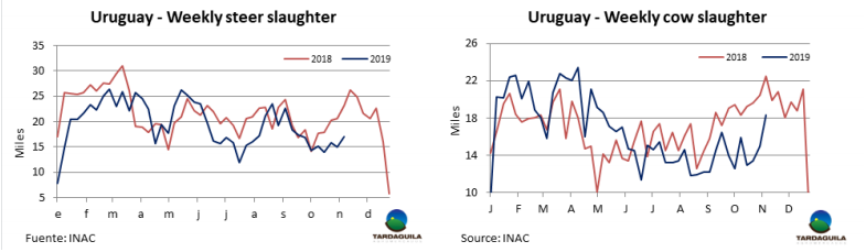 根據(jù)南方共同市場4個國家官方數(shù)據(jù)統(tǒng)計,2019年前10個月南方共同市場4個國家牛屠宰量比2018年同時期減少25萬頭。巴西上個月的數(shù)據(jù)只是暫時情況,在接下來幾周一定會有所增長,但這并不會扭轉牛只屠宰量的減少趨勢。數(shù)據(jù)表明,1月-10月,南方共同市場牛只屠宰量3518萬頭,比2018年前10個月減少25萬頭,肉類生產的減少量是6-7萬噸。主要是巴西、巴拉圭和烏拉圭屠宰量有減少,部分抵消了阿根廷牛只屠宰量30萬頭的增長。