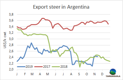 大選結果確定和貨幣兌換管控過后出口價格仍然堅挺。英國純種閹牛報價140-145比索/公斤,印度串種閹牛報價136-140比索/公斤,母牛價格上漲趨勢受中國需求影響,仍保持上漲趨勢:特種和良種母牛報價140-145比索/公斤,工業(yè)母牛報價125-130比索/公斤。