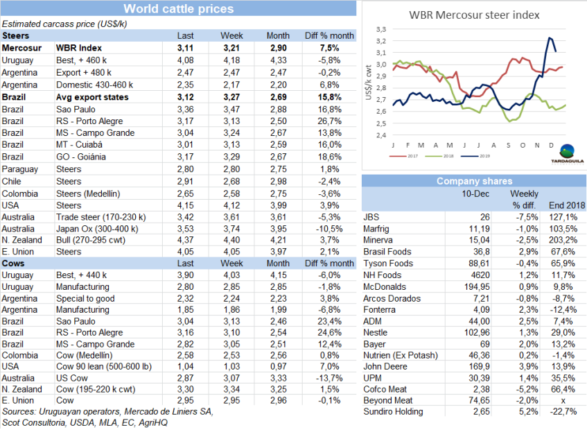 受巴西和烏拉圭影響,南方共同市場(chǎng)閹牛平均價(jià)格本周顯著下行。世界牛肉周報(bào)南方市場(chǎng)閹牛價(jià)格下跌10美分,胴體價(jià)格下跌至3.11美元/公斤。主要受巴西影響,巴西主要出口州育成牛價(jià)格下跌12雷亞爾,下跌至194.3雷亞爾/15公斤;按美元計(jì)算下跌12美分下跌至3.12美元/公斤。烏拉圭本周仍處于下跌趨勢(shì),本周下跌10美分,胴體價(jià)格下跌至4.08美元/公斤。阿根廷方面盡管政府換屆,育成牛市場(chǎng)保持幾周來的狀況沒有改變,育成牛價(jià)格2.47美元/公斤,是南方共同市場(chǎng)最低價(jià)格。巴拉圭胴體價(jià)格2.8美元/噸,四周來價(jià)格保持不變。
