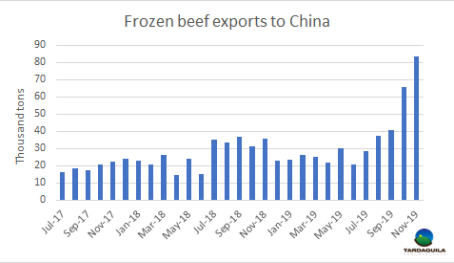 11月巴西對(duì)中國出口冷凍牛肉83111噸,比中國增加新工廠準(zhǔn)入前常規(guī)出口量增加一倍多。11月巴西牛肉出口總量140249噸,到中國出口量占出口總量的59%。其次是到中國香港出口量,16551噸,這意味著直接到達(dá)中國主港和通過水漂渠道進(jìn)入中國的進(jìn)口總量約10萬噸。上個(gè)月,沒有其他目的地進(jìn)口量與中國相當(dāng)。埃及、伊朗和俄羅斯發(fā)貨量均在4000-5000噸。2019年截至11月,巴西對(duì)中國主港牛肉出口總量402萬噸,同比增長(zhǎng)37%,對(duì)中國香港出口量20.2萬噸,同比減少21%。