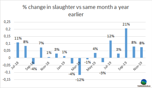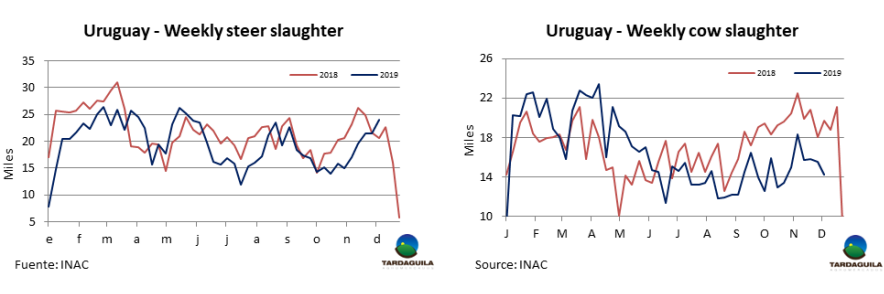 上周牛只屠宰量提高,一部分由于是歐洲481配額牛只生產(chǎn),還因?yàn)槿彼臍夂驙顩r導(dǎo)致草飼牛供應(yīng)增長(zhǎng)。烏拉圭肉協(xié)報(bào)道,截至12月7日的一周合規(guī)屠宰場(chǎng)屠宰牛只47124頭,比上一周增長(zhǎng)1.2%,(增長(zhǎng)540頭),創(chuàng)5月最后一周至今6個(gè)月以來新高。由于屠宰活動(dòng)集中于1月1后下一季度481配額牛只生產(chǎn),閹牛和小母牛占大多數(shù),閹牛屠宰量24034頭,比上周增長(zhǎng)2549頭,達(dá)5月25日以來周屠宰量最大。小母牛屠宰量比上周減少,但仍然很高(7767頭),母牛屠宰量減少1229頭,減少至14268頭。全球屠宰量與去年同期幾乎相同,但構(gòu)成卻大不相同:閹牛和小母牛屠宰量增長(zhǎng)5000頭以上,母牛屠宰量減少5.4萬頭以上。屠宰量最大的三個(gè)工廠是Las Piedras(4020頭),NH-BPU(3986頭),Marfrig-Tacuarembo(3523頭)。Marfrig4家廠總屠宰量13155頭,屠宰量是2月中旬以來最大。Minerva2家廠屠宰量6762頭。