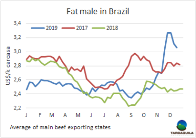 本周在巴西主要的活牛交易市場(chǎng)育成牛價(jià)格再次出現(xiàn)下行,近幾日有穩(wěn)定跡象,有些地區(qū)甚至出現(xiàn)上行修正。牛只供應(yīng)有限,需求也是一樣,預(yù)計(jì)接下來幾天會(huì)繼續(xù)縮減,因?yàn)橐恍┕S在今年年末和2020年年初停止屠宰活動(dòng)。圣保羅期貨市場(chǎng)第一批期貨(12月到2月)價(jià)格上漲,尤其是12月的合同價(jià)格上漲了6.6雷亞爾/15公斤,2020年年中以后仍然呈下行趨勢(shì)。批發(fā)市場(chǎng)牛肉價(jià)格繼續(xù)下跌。