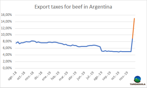 上任一周以來,宣布一系列聲明后,基什內(nèi)爾政府阿爾貝托·費(fèi)爾南德斯希望國(guó)會(huì)今天批準(zhǔn)《經(jīng)濟(jì)緊急狀態(tài)法》草案,該草案于昨日在議會(huì)上提交,將賦予他非凡的權(quán)力,在許多微妙的問題上避免立法的干預(yù)。此前,上周六發(fā)布了一項(xiàng)法令通過更改百分比,修改了前任政府2018年9月恢復(fù)出口加征關(guān)稅的規(guī)則,以前每出口1美元征收一定數(shù)量阿根廷比索的稅。(每出口1美元牛肉征收3阿根廷比索)。整體性的規(guī)則還未明確,大致分析的結(jié)果是牛肉的有效出口稅被定在9%,比15個(gè)月前打算加征的8%高1個(gè)百分點(diǎn),考慮到比索貶值的影響,出口稅的數(shù)額比上周增長(zhǎng)了4.2個(gè)百分點(diǎn)。該措施導(dǎo)致大豆出口稅率達(dá)30%,糧食和其他油籽稅率為12%。昨天,所有這些推理都變得抽象,因?yàn)樵谡M裉飓@得批準(zhǔn)的經(jīng)濟(jì)緊急措施系列計(jì)劃中,對(duì)大豆的出口稅改為了33%,對(duì)2018年9月2日(馬克里重新征收出口稅之前)沒有涉及的產(chǎn)品,例如小麥,玉米和牛肉征收出口稅15%。根據(jù)當(dāng)前的閹牛出口價(jià)格,按照稅率增長(zhǎng)9%計(jì)算,每公斤胴體將被征收額外的17美分,如果稅率變?yōu)?span>15%,進(jìn)口稅將增長(zhǎng)約38美分。