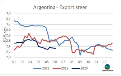 4月冰鮮牛肉平均出口離岸價(jià)7060美元/噸,冷凍牛肉平均出口離岸價(jià)4400美元/噸,較2019年4月分別下跌20.9%和1.1%。平均下跌幅度為14.2%,較3月平均出口價(jià)下跌9.4%。阿根廷牛肉推廣局報(bào)告稱價(jià)格并不平衡,出口至德國價(jià)格下跌18.4%,出口至以色列價(jià)格下跌了2.8%,出口至中國價(jià)格下跌了6.2%(與2019年12月相比下跌了26.6%),到智利出口價(jià)增長了5.6%,到巴西出口價(jià)增長了7.8%,到俄羅斯出口價(jià)增長了5.8%。