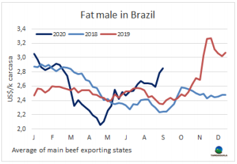 供應(yīng)短缺繼續(xù)籠罩活牛市場,因此本周牛價再次上漲,昨天巴西主要出口州育成牛價格上漲至229.4雷亞爾/15公斤,較四月下半月開始上漲時上漲了27%。除圣保羅以外的地區(qū)預(yù)定期限都很短,大約在六天。批發(fā)市場后部位肉價格繼續(xù)上漲,前部位肉可能由于出口到中東市場有困難,價格稍有平衡。