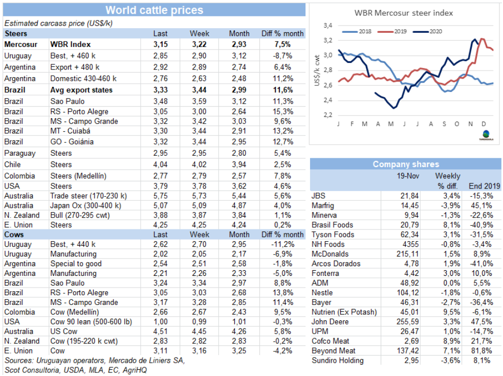 本周烏拉圭育成閹牛價(jià)格達(dá)南美地區(qū)最低,這是近十年來(lái)鮮有發(fā)生的,也是2017年四月以來(lái)第一次達(dá)本地區(qū)最低。本周烏拉圭特種出口閹牛成交價(jià)2.85美元/公斤,低于阿根廷的出口閹牛成交價(jià)2.92美元/公斤和巴拉圭的胴體成交價(jià)2.95美元/公斤。巴西牛價(jià)仍明顯高于其他地區(qū),盡管上漲的趨勢(shì)有所停頓,上周開(kāi)始牛價(jià)走勢(shì)下行調(diào)整,巴西主要出口州育肥牛平均價(jià)格下降了11美分,下降至3.33美元/公斤。南方共同市場(chǎng)閹牛價(jià)格指數(shù)本周下降了7美分,下降至3.15美元/公斤。