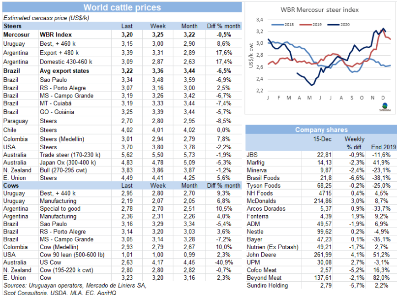目前還沒有定論,但進口商有意對1-3月與南美國家簽訂的猶太屠宰合同重新議價。一位以色列進口商稱,“我們確信,我們將無法繼續(xù)按目前的價格對巴西和巴拉圭支付貨款?!钡谝淮握秸勁锌赡軙谙轮芘e行,屆時將看到新的進展。一家巴拉圭工廠稱,目前重新談判的牛前部位肉參考價6000美元/噸的合同是“可行的”。他解釋說,調(diào)整的空間將主要取決于牛價是否維持上周的下行通道,育成牛價格低于3美元/公斤(每公斤2.70美元)0.30美元。