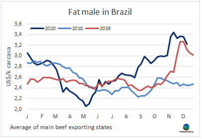 阿根廷牛價飆升,成為南美地區(qū)牛價最高的國家,這是自2017年至今三年來從未發(fā)生過的事情。本周育肥閹牛供應(yīng)短缺再次推高價格。包含出口稅的美元價格3.39美元/公斤,較上周上漲了8美分。烏拉圭閹牛價格也由于供應(yīng)短缺大幅上漲,本周成交價3.15美元/噸。恰恰相反,巴拉圭和巴西的牛價下行,本周巴西牛價按雷亞爾計下跌了5%,雷亞爾0.7%的升值部分抵消了雷亞爾價格的下行。巴西中央銀行表示,即將放棄將參考利率保持在最低水平的承諾,目前美元雷亞爾匯率為5.育成牛平均價格本周下跌了14美分至3.22美元/公斤。巴拉圭方面育成牛價格下跌至2.7美元/公斤。因此,南方共同市場閹牛價格指數(shù)下跌了5美分,下跌至3.2美元/公斤。