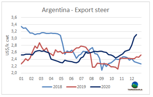 新的一年阿根廷將獲得2021年在美國市場2萬噸的肉類免稅配額,這些配額按照“先到先得”的原則分配。因此,被批準(zhǔn)出口至美國的肉類加工商已經(jīng)準(zhǔn)備向美國出口肉類,在其他市場,尤其是歐盟市場波動之際,這是一個很好的補充。據(jù)了解,后部位肉的售價在5500-5800美元/噸,還有一些西冷,由于歐盟市場的反彈,西冷價格將會上漲。