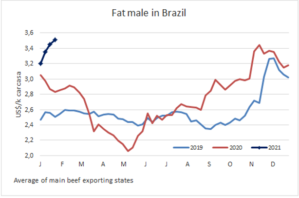 待宰牛數(shù)量的短缺將支撐巴西育肥牛價格到三月末四月初保持堅挺。目前,飼養(yǎng)場沒有足夠數(shù)量的育肥牛,也沒有用于補欄的牛?!北M管市場預期堅挺,價格不會超過12月的高點,因為當時的需求更高。巴西的活牛市場正在經(jīng)歷存欄重建的階段,但 “這只是一個開始”,因此還不會對小牛生產(chǎn)產(chǎn)生重大影響。因此,預計小牛價格也將保持堅挺。美麗華在巴西以外的子公司Athena Foods以3億美元的總價從JBS收購了Canelones肉類工廠,包括JBS在巴西以外的南美(阿根廷、巴拉圭和烏拉圭)所有部門。