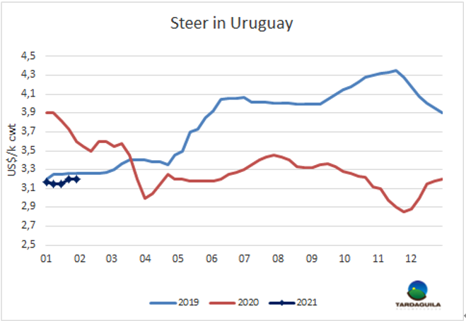 今年肉牛銷售額下降3.23億美元至18.63億美元,為過去四年的最低水平,下降了14.8%。以恒定比索計算,由于美元自去年3月以來的復蘇,降幅稍小一些,為7.2%。美元銷售額下降是由于活牛出口增加,待宰牛銷售量下降。待宰牛數(shù)量減少了22.5萬頭,至200萬頭。但肉類產(chǎn)量的降幅較小,只有7.5%,這是由于平均屠宰重量增加,因為閹牛屠宰量占比增加,且各類別的牛平均重量均有增加。2020年平均胴體重259.5 kg,年均增長7.2 kg(+2.9%)。平均價格下降了6.7%至872美元/頭。銷售量減少和平均價格下降使屠宰牛的銷售額減少3.36億美元(-16.1%)至17.5億美元?;钆3隹诜矫?,雖然貿(mào)易數(shù)量減少,但平均出口價格的增加(賣給中國用于繁殖目的的小母牛的比例很高)使出口額增加了大約1300萬美元,達1.13億美元。由于美元增值,按烏拉圭比索計價(生產(chǎn)商支付運費、人工費等),銷售額降幅較小。2020年平均1美元兌42比索,2019年1美元兌35.3比索,今年的通脹率達9.4%,因此按恒定比索計算,肉牛成交額下降了7.2%。