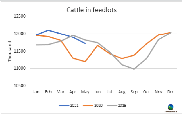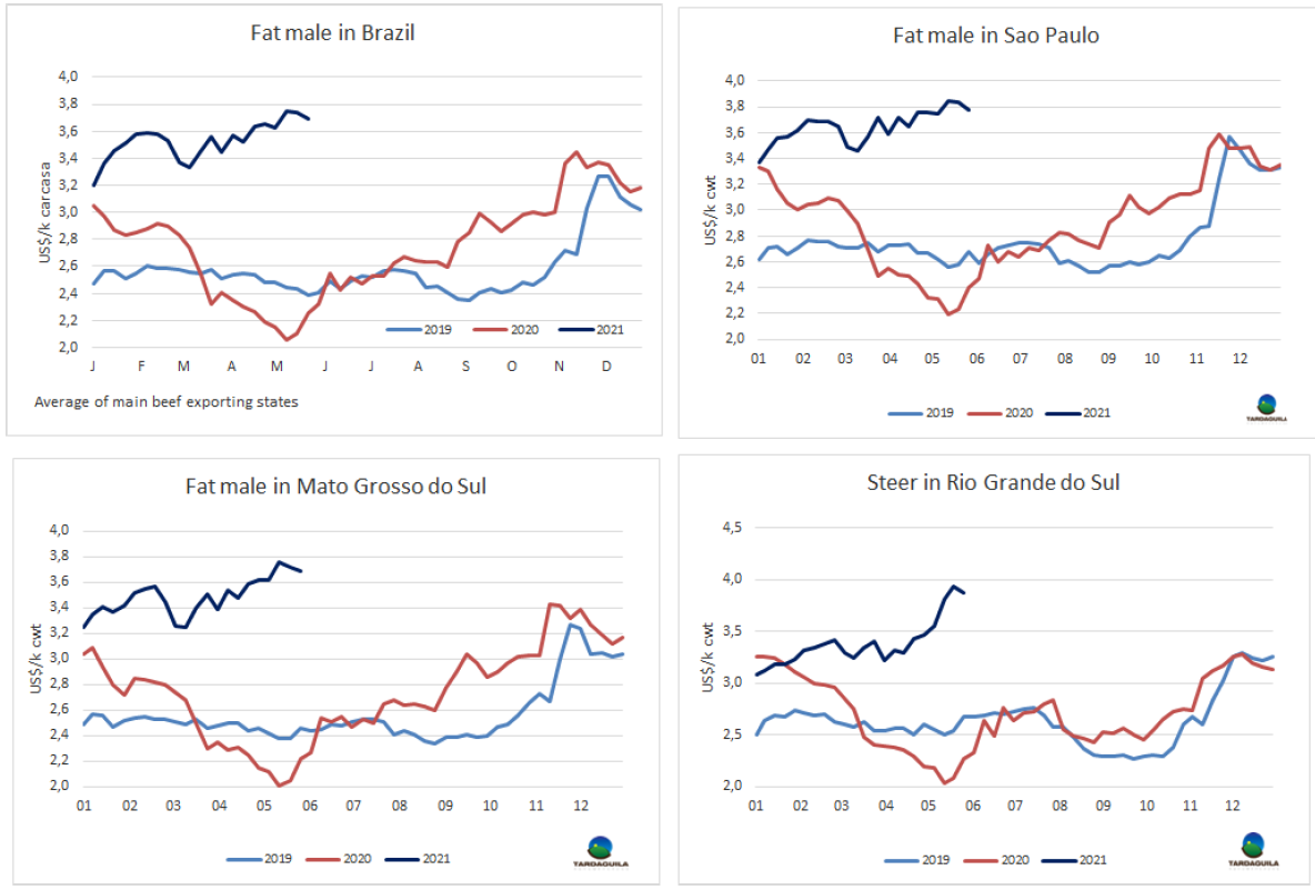 自2018年七月起,巴西牛肉月出口量連續(xù)34個(gè)月超過10萬噸。在此之前,月出口量超過10萬噸連續(xù)最長的階段是自2006年5月至2007年6月的連續(xù)14個(gè)月。據(jù)分析,這是強(qiáng)勁的國際市場需求所導(dǎo)致的,尤其是來自中國的需求。巴西的產(chǎn)能無法跟上日益增長的需求,帶來的結(jié)果則是待宰牛、架子牛和國內(nèi)市場牛肉價(jià)格的持續(xù)上漲。2018年7月育肥牛平均價(jià)格209雷亞爾/15公斤,2018年年末育肥牛價(jià)格上漲至219雷亞爾/15公斤。2019年年初育肥牛參考價(jià)220雷亞爾/15公斤,2020年育肥牛價(jià)格達(dá)300雷亞爾/15公斤。2021年前5個(gè)月育肥牛價(jià)格達(dá)310雷亞爾/15公斤,今年年底到期的期貨合約價(jià)格將達(dá)約330雷亞爾/15公斤。