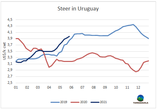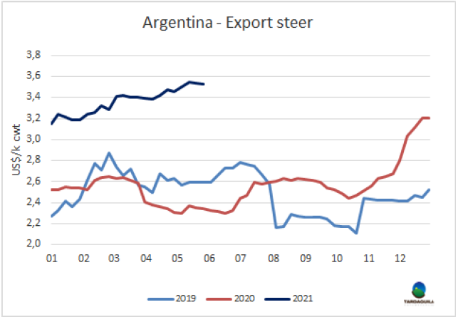 巴拉圭出口商期望智利宣布的重新開放活動能夠重新激活進(jìn)口市場。目前進(jìn)口商20部位全牛采購價(jià)不超過5400美元/噸,距出口商對新合同的報(bào)價(jià)低400美元/噸。