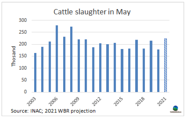 上周牛屠宰量再次增長,烏拉圭肉協(xié)報(bào)告統(tǒng)計(jì),上周屠宰量55712頭,較前一周增長了2000多頭,達(dá)今年周屠宰量的第二高。較去年同期增長了超過10000頭。隨著歐洲481配額的生產(chǎn)全面打開,閹牛屠宰量達(dá)29938頭,達(dá)2018年3月第三周至今三年多以來最大,同樣,小母牛屠宰量達(dá)6263頭,達(dá)3月第一周以來最大。相反,母牛屠宰量下降至18598頭,較上周下降了2432頭。屠宰量最大的工廠是Athena-Pulsa(4956頭),Las piedras(4532頭),Athena-Canelones(4476頭)。本周Athena三家工廠屠宰總量13639頭,Marfrig四家工廠屠宰總量13772頭,日資企業(yè)BPU上周五進(jìn)行了最后一次屠宰活動,本周暫未開始屠宰,還在等待中國市場的重新準(zhǔn)入。截止5月22日,牛屠宰量達(dá)160548頭,較2020年同期增加了15575頭,約增長了20%。如果不出現(xiàn)疫情相關(guān)的重大問題,五月屠宰量將超過22萬頭,達(dá)10年以來最高。 5月也將成為連續(xù)第八個(gè)屠宰量高于去年同期的月份。