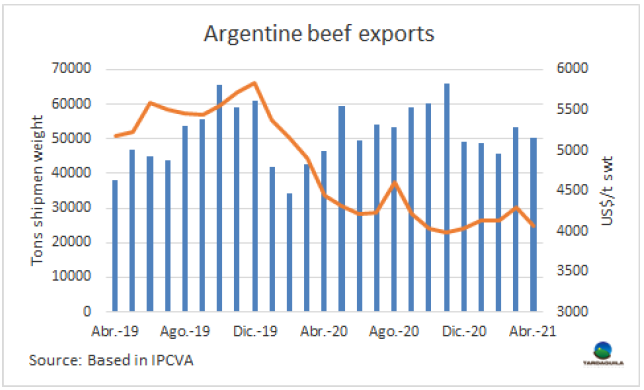 阿根廷政府為控制國內(nèi)肉類價(jià)格的上漲實(shí)行了30天的出口禁令,該禁令排除對該國有關(guān)稅配額的出口活動,如希爾頓配額,481配額,美國配額和哥倫比亞配額。對以色列冰鮮產(chǎn)品的出口是否可以排除在外還不能確定。希爾頓配額和481配額代表著絕大多數(shù)牛肉對歐盟的出口量。2021年前四個(gè)月,阿根廷對歐洲冰鮮牛肉出口量達(dá)10187噸,出口額達(dá)9010萬美元,481配額出口量1540噸。同一時(shí)期阿根廷對美國出口量4427噸,占配額總量的22.7%,出口額2660萬美元。哥倫比亞的配額目前關(guān)聯(lián)不大。因此,被排除的出口量占總出口量的7.4%,由于這些產(chǎn)品的成交價(jià)格很高,按美元計(jì)的占比可能更高。除中國市場外,受出口暫停政策影響的市場主要是以色列、智利和巴西。除這些市場之外,目前正在進(jìn)行的發(fā)貨包括上周一(正式知道禁令的那一天)之前簽訂的所有銷售訂單,以及在聲明和該措施生效(周四公布第75號決議)之間登記的銷售訂單。在此期間,許多出口商仍在繼續(xù)進(jìn)行牛肉出口。