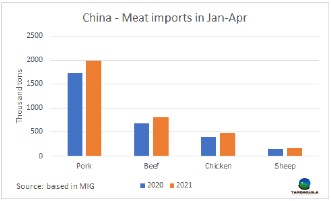據(jù)梅特國際集團(tuán)發(fā)布的數(shù)據(jù),2021年前四個(gè)月中國牛肉進(jìn)口量達(dá)350萬噸,較2020年同期增長了50萬噸,增長了17%。貿(mào)易的增長主要體現(xiàn)在四種主要肉類上。今年年初羊肉產(chǎn)量很低,現(xiàn)在已經(jīng)回升,比去年同期增長了28%,在四個(gè)月的時(shí)間里增加了17.4萬噸。今年4月,中國進(jìn)口羊肉5.04萬噸,比2020年同月增長了37%。主要進(jìn)口肉類仍是豬肉進(jìn)口量達(dá)200萬噸,同比增長了15%,牛肉進(jìn)口量81.5萬噸,同比增長了19%,雞肉進(jìn)口量48.8萬噸,同比增長了21%。