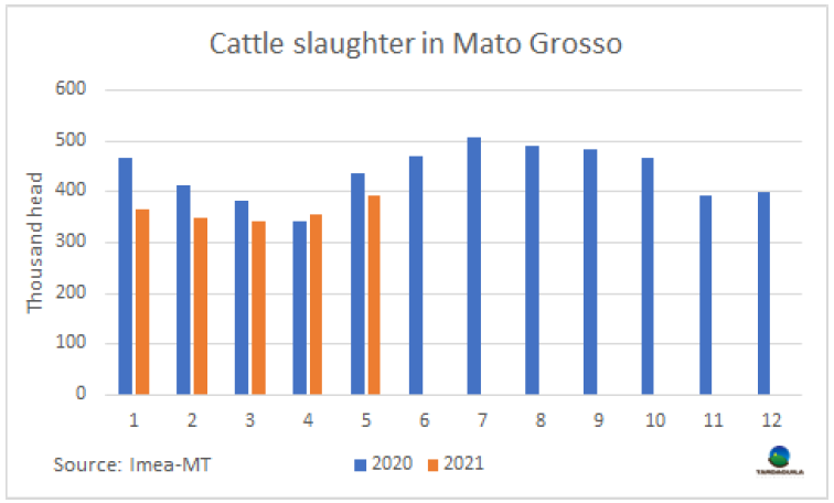 巴西活牛存欄最大的州馬托格羅索州(約占總存欄量的15%)五月屠宰量將同比下降了10.1%,至39.2萬(wàn)頭。今年前五個(gè)月馬托格羅索州屠宰總量181萬(wàn)頭,較去年同期減少了23.3萬(wàn)頭,減少了11.4%。五月公牛屠宰量22.297萬(wàn)頭,牧牛圖再亮16.92萬(wàn)頭,母牛屠宰量?jī)H占總屠宰量的43.2%。五個(gè)月的總屠宰量中,母牛屠宰量78.1萬(wàn)頭,也占總屠宰量的43.2%。應(yīng)用經(jīng)濟(jì)研究所表示,屠宰量減少最顯著的地區(qū)主要在繁殖區(qū)(該州西北部),而越冬區(qū)屠宰量增加。