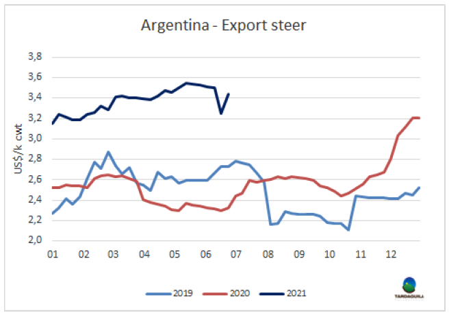 昨天政府宣布了一項(xiàng)新的牛肉出口計(jì)劃。本期牛肉周報(bào)發(fā)表之時(shí),總統(tǒng)令的內(nèi)容(DNU)尚未完全公布,但政府宣布了一般條款,牛肉出口量不得超過(guò)2020年出口量的50%,二分體,四分體,和以下其中部位肉禁止出口:肋排、玫瑰肉、牛腩、大米龍,臍橙板、肋排邊、肩胛。下午,出口商表示強(qiáng)烈反對(duì),以至于政府承諾今天為他們舉行一次“澄清會(huì)議”。質(zhì)疑聲包括上個(gè)月被出口禁令豁免的希爾頓481和美國(guó)等關(guān)稅配額和以色列市場(chǎng)的出口(其大使上周強(qiáng)烈抗議)是否包含在50%的出口限制中。阿根廷2020年出口牛肉量89.7萬(wàn)噸,如果配額包含在50%的出口限制以內(nèi),每月可出口牛肉量為37375噸。此外,據(jù)稱,農(nóng)牧漁業(yè)部將在一個(gè)月內(nèi)將推出一個(gè)畜牧計(jì)劃 ,其主要目標(biāo)是提高牛肉產(chǎn)量,超過(guò)當(dāng)前的320萬(wàn)噸,至500萬(wàn)噸/年。他們正在為此研究的措施,正如生產(chǎn)發(fā)展部部長(zhǎng)Matías Kulfas在一次采訪中所說(shuō),將實(shí)行包括稅收激勵(lì)、技術(shù)和牧場(chǎng)的軟信貸,以及增加屠宰重量的激勵(lì)措施。政府在會(huì)上表示,當(dāng)國(guó)內(nèi)市場(chǎng)牛肉的價(jià)格穩(wěn)定, 可以允許出口量擴(kuò)大,這在一個(gè)的2021年第一季度按年計(jì)通貨膨脹率62%的國(guó)家似乎是一個(gè)笑話。鑒于糟糕的經(jīng)濟(jì)形勢(shì)和近9萬(wàn)人死于Covid-19,本屆政府在今年的中期選舉中表現(xiàn)一般,9月將舉行初選,11月將舉行第二輪選舉。最近到來(lái)的疫苗將是主要的支撐依據(jù),而“價(jià)格便宜”的肉類似乎是另一支撐。