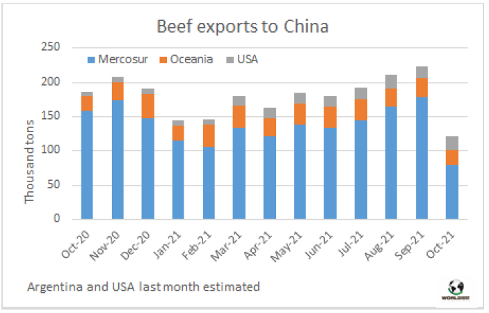 歐洲迎來了第四波新冠疫情后,各國政府采取的不同的措施使出口市場非常悲觀,持續(xù)至十月中旬的上漲趨勢結(jié)束。阿根廷方面的消息人士稱希爾頓配額產(chǎn)品很難賣,因為一些客戶在新一波疫情到來時不愿意采購,因為手里有一些庫存,加上即將到港的敞口,他們認為不需要更多了。另一位經(jīng)理人稱甚至有一些取消合同的情況,阿根廷臀腰肉價格下跌到13000美元/噸,現(xiàn)在還有更低一檔的參考價,12500-12700美元/噸,今年年底市場會好轉(zhuǎn)的希望渺茫。
