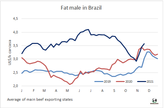 據(jù)馬托格羅索農(nóng)業(yè)經(jīng)濟研究所統(tǒng)計,與9月相比,馬托格羅索州牛屠宰量增長了5.8萬頭,達38.639萬頭,較2020年同期下降了8.2萬頭,約下降了17.5%。本月屠宰量的增長主要集中于公牛屠宰量的增加,約28.424萬頭,較9月增長了6.9萬頭。育肥場出欄的公牛數(shù)量增長給公牛屠宰量增長提供支撐,主要為12-24月齡的牛,約11.429萬頭。相反,母牛屠宰量較9月下降了1萬頭?!?span>11月待宰牛數(shù)量較少,因為農(nóng)民預期成品牛的價格會提高,因此將大部分牛被壓欄?!?span>
