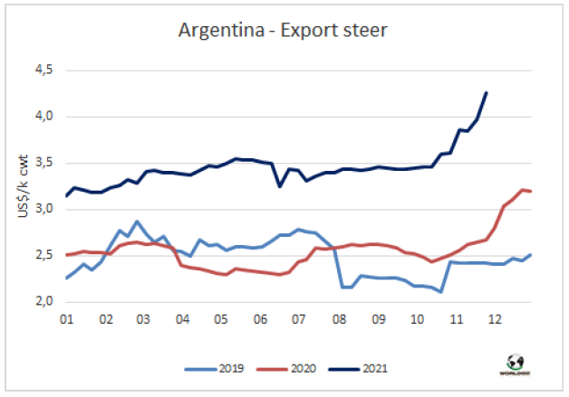 上周活牛價格保持上漲趨勢,本周出口閹牛價格上漲了20-30比索/公斤,質(zhì)量最好的英國純種閹牛參考價410-430比索/公斤,澤布雜交牛價參考價400-420美元/公斤,質(zhì)量最好的母牛價格上漲了20比索至340-350比索/公斤,工業(yè)母牛參考價上漲了15比索至290-300比索/公斤。僅上個月出口閹牛的比索價格上漲了18%-20%,特優(yōu)母牛價格上漲了17%,工業(yè)母牛價格上漲了13%。其主要原因是日益增長的出口需求(每月3500噸猶太潔食屠宰配額和希爾頓部位肉的屠宰計劃更好的整合,加上481配額的預期發(fā)貨和向中國出口的5000噸母牛產(chǎn)品配額),盡管在通貨膨脹嚴重的背景下出口帶來的價值略有延遲。