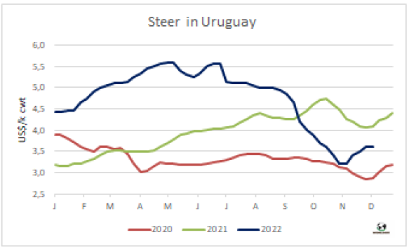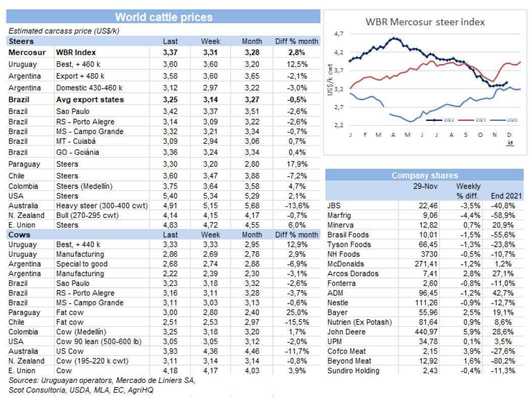 南方共同市場閹牛價格指數(shù)離開過去五周的窄幅波動區(qū)間,本周該指數(shù)上漲了6美分,至3.37美元/公斤,主要受巴西牛價上漲的拉動。巴西主要出口州育肥牛價格上漲11美分至3.25美元/公斤,主要因為雷亞爾價格上漲,以及匯率升值1.5%。巴拉圭方面,價格也有上漲,待宰閹牛價格上漲了10美分至3.3美元/公斤。阿根廷方面,出口閹牛比索價格上漲匯率下降導致美元價格下跌2美分至3.58美元/公斤。烏拉圭連續(xù)四周的上漲趨勢停止,本周牛價保持3.6美元/公斤。