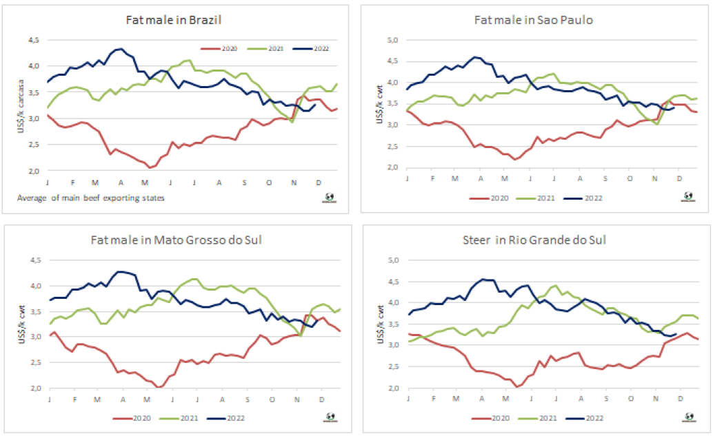 Agrifatto咨詢公司的畜牧經理預測,隨著公牛和母牛屠宰量的同步增加,牛肉價格應該在年末幾周下降。在馬托格羅索的一次采訪中,他說,在消費較低的時候,市場上肉類供應增加,這應該會轉化為終端消費下個的下降。農民已經感受到了價格的下降,與去年同期相比,育肥牛價格下降了11%,但消費者還沒有感受到。Agrifatto預測,隨著國內市場的供應進一步增加,牛肉價格的下跌將持續(xù)到2023年。
