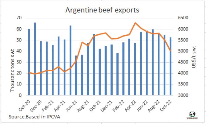 繼9月牛肉出口量下降之后,10月牛肉出口量再次下降,僅52769噸(其中8700多噸是帶肉的骨頭,價值非常低),環(huán)比減少5.8%,但比去年同期增加25.5%。出口額達2.65億美元,環(huán)比下降13.3%,同比增長9.2%。平均價格略高于5000美元/噸,是2021年年中以來的最低水平。
