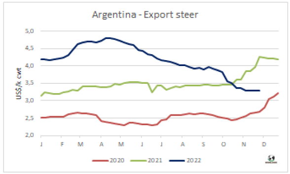 希爾頓臀腰肉價格連續(xù)四周保持回升,阿根廷方面參考價10500-11100美元/噸,烏拉圭離岸價格在9700-10000美元/噸。一名烏拉圭出口商認為,目前是短暫的旺季,很多人擔心冬季來臨,能源危機遠未結束。